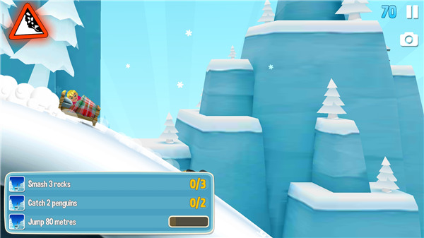 6、同时也要完成游戏给出的任务,每局游戏开始系统都会给出要完成的若干小任务,通常都是些完成高难度动作、收集奖励等等并不复杂的任务,完成后系统会给出各种奖励机制,步步解锁下去的话,游戏就会更紧张有趣。途中还会遇见木房、搭板、指示牌等物体,这些东西如果被利用合适的话,能帮助人物的滑行,但如果接触方式稍有偏差,就会变成逃生路上的另一阻碍。例如木房,如果玩家能从合适的角度从房顶切入,那么房顶的弧度就能被利用成加速坡,如果角度不当,角色就毫无意外地摔跤;