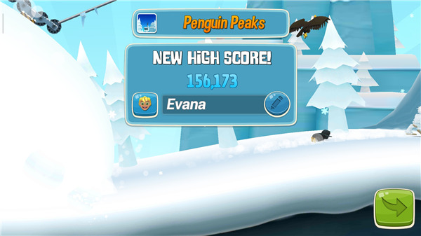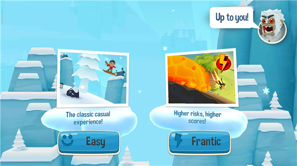 5、接着进入游戏便可开始,需要在雪崩来临之前快速前进,屏幕左侧上方的雪崩警示牌会在雪堆即将接近时不断地闪烁以示警告,即时你已经在视野中能够看到背后奔腾而来的大雪,如果此时爬起继续滑行,那么甩掉这近在咫尺的雪堆也并非不可能;