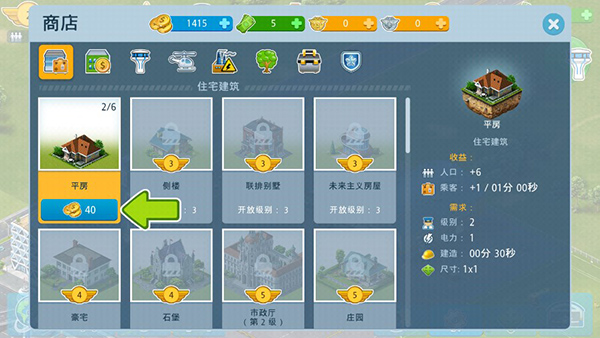 玩家点击左下角购物车图标,即可进入商店,可以购买住宅、机场建筑、装饰等。