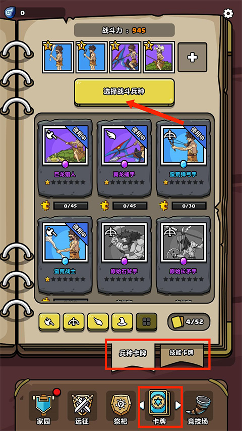 8、在卡牌界面,包括兵种卡牌和技能卡牌两大栏目,在兵种卡牌栏目可以选择战斗兵种,自由的进行搭配,也可以查看各个战士卡牌的属性并且进行强化,