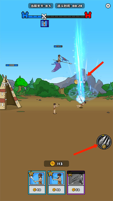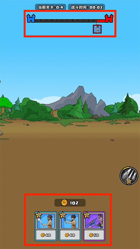 4、进入战斗界面,我们可以点击下方的战士让他们加入战斗,不同的战士需要相应的金币,上面的蓝色方为我们的进度条,先到达并且击败对方基地的为获胜方,