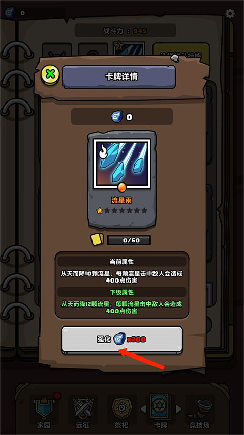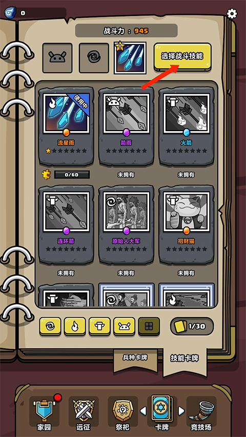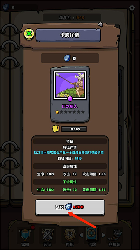 9、在技能卡牌两大栏目,可选择战斗技能,查看各个技能的属性和强化,