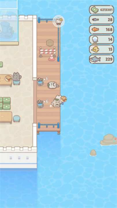 控制猫咪进入左侧海域,潜入深海捕捉不同种类的鱼类,每次潜水都可能带回新的食材,为餐厅提供丰富的原料。