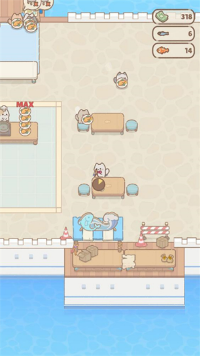 玩啊及可通过滑动屏幕,控制猫咪移动,前往带“+”号的区域,花费金币解锁各种餐厅设施,逐步扩展经营范围。