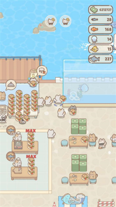使用在海洋中捕获的鱼类烹饪精美料理,满足前来就餐的猫咪顾客需求,赚取金币升级餐厅。