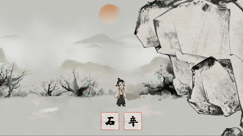 5、操作主角向右走,和士兵小哥对话完成之后,将士兵小哥和旁边的石头收集起来得到石和卒,将两个字结合成为碎,将碎字放到石头上