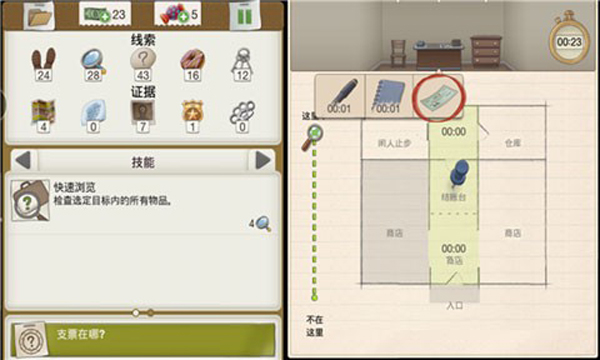 2、下面就是搜寻画作了,在名演员回来之前你一共有45分钟的时间,每搜寻一片区域就会消耗一部分时间,按住那片区域就可以进行搜寻了,系统会根据你搜寻的位置,给出距离寻找物体是进了还是远了,依照判断和系统的提示我们最后会在沙发底部寻找到那幅画。又一个案子解决了!