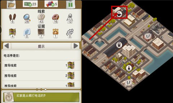 1、首先我们得找到他家住在哪里,我们现在需要利用之前收集的线索去寻找,你有三条线索,选中一条线索,大家就会看到图中部分区域变亮了,那是名演员家潜在的位置,依次查看三条线索,找到交集的位置,那里就是名演员的家了,具体的位置是在如图所示的位置。