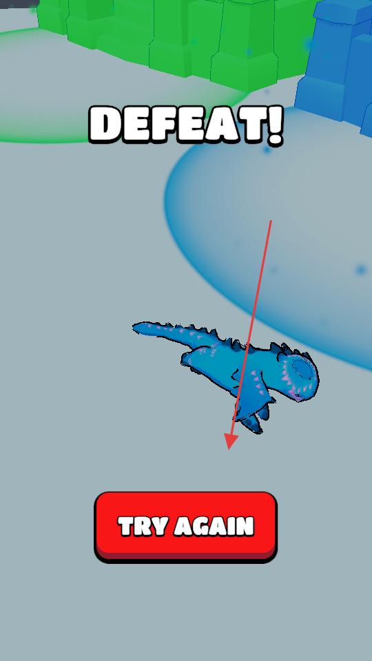 4、若对战失败,界面会显示DEFEAT的提示,此时点击红色的TRYAGAIN按钮,重新进入游戏,再次进行收集龙蛋、移动攻击的操作。