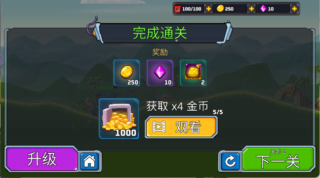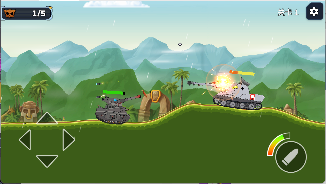 2、战斗中利用地形优势,调整发射角度瞄准敌方坦克,点击发射按钮攻击,留意血条状态,消灭全部敌人即可通关获取金币与钻石奖励。
