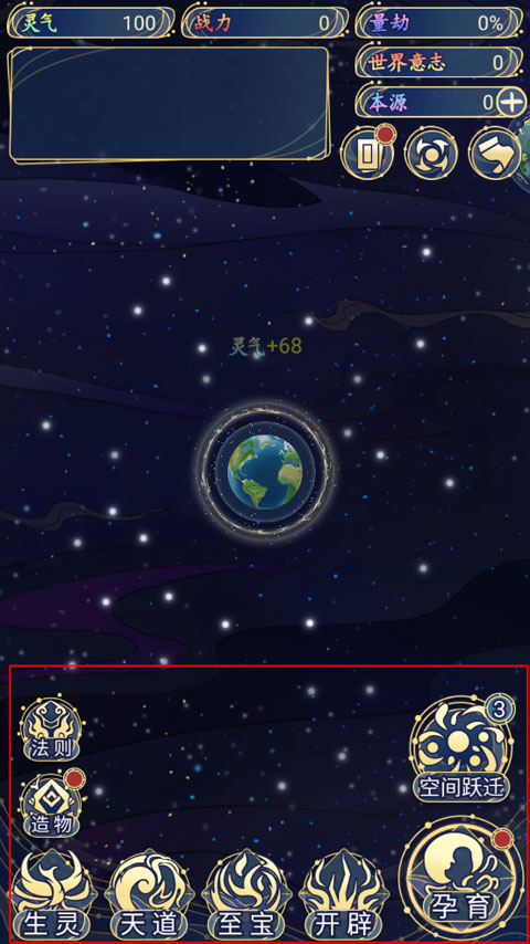 2、游戏主要包含法则、造物、生灵、天道、至宝、开辟、孕育以及空间跃迁玩法。