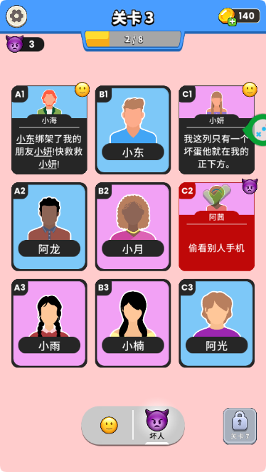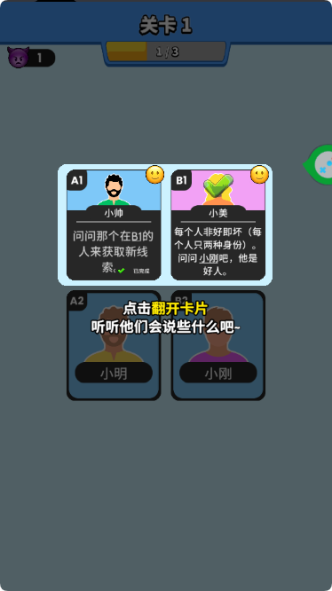 2、每个关卡都会有一张卡牌是公开的,玩家通过第一张卡牌给到的信息进行推测,选择下方的好人/坏人点击其他卡面;
