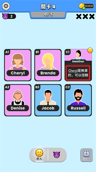 1、进入关卡后将首先获得一张已公开的卡牌,根据其提供的信息判断线索方向,并通过判断好人或坏人身份来展开推理。