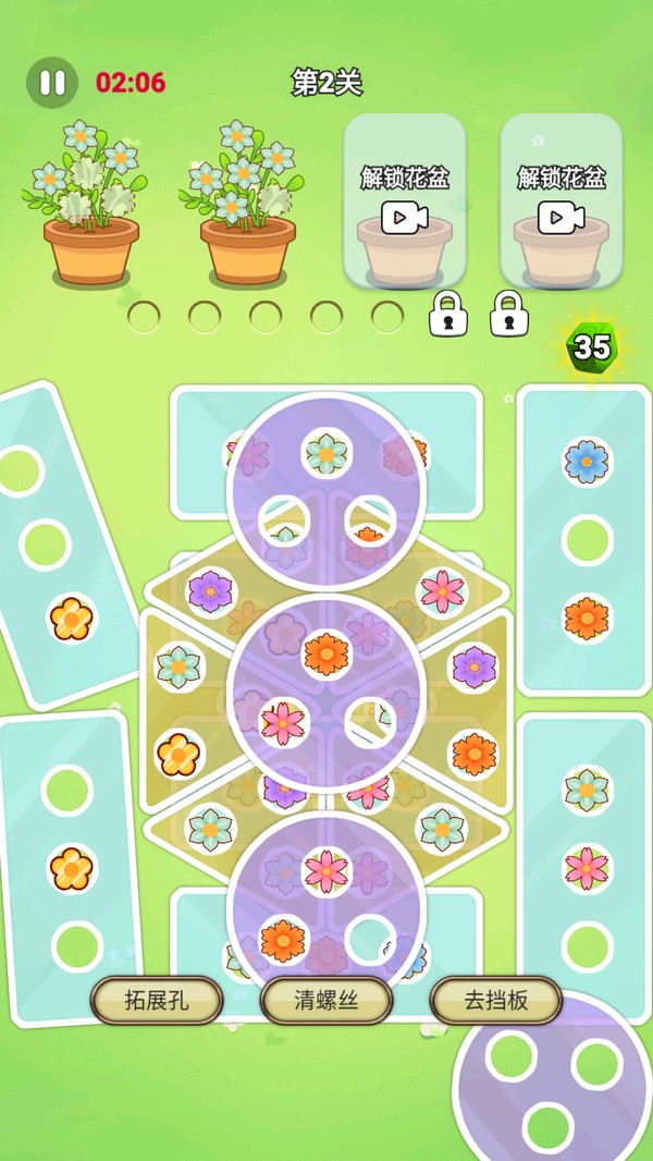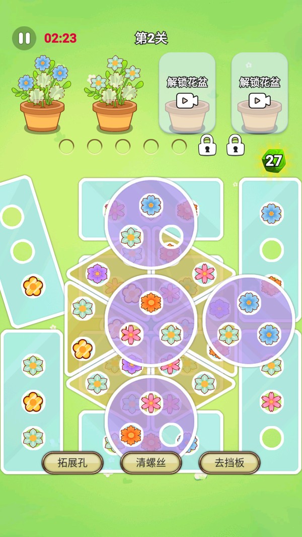 1、游戏的画面精美细致,花朵的颜色鲜艳多样,背景音乐轻快愉悦,消除指定数量的花朵。