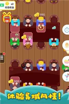 玩家可以进行餐厅装修,招募店员提升上菜速度,获得更多金币。