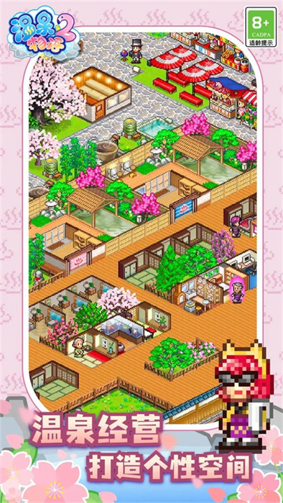 温泉物语2是一款模拟经营类游戏,玩家需要经营一座位于深山中的温泉旅馆。在游戏中,玩家需要不断建设客房、售卖零食的商铺,并挖掘新的温泉以打造更多的温泉游玩设施,目标是建造出全世界一流的温泉旅馆。