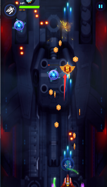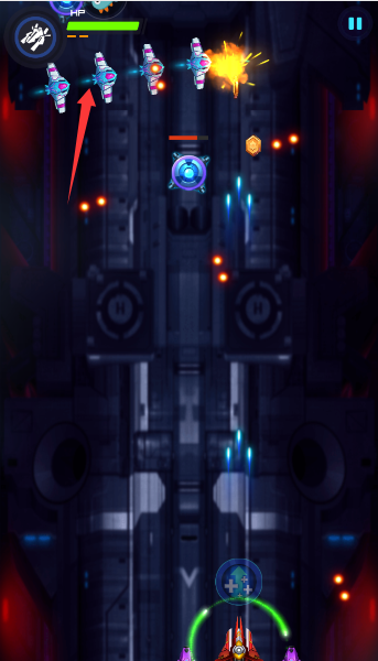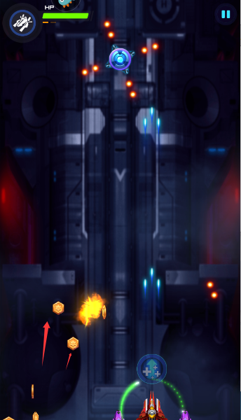 1、手指滑屏遥控你的红色战机溜达,务必盯紧左上血条,别让宝贝飞机变成烟花。
