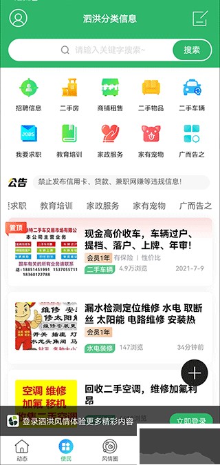 2、在便民版块,可以找工作、找家政、租店铺,也能自己发布招聘或求职帖。