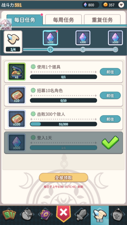 1. 进入游戏后,点击屏幕下方的任务栏,完成指定目标就可以获得资源奖励,加快成长速度。