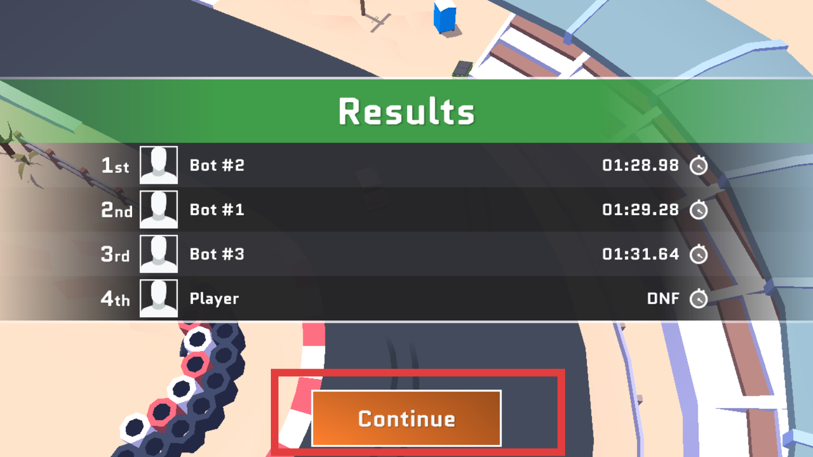 3、比赛结束后,查看比赛结果界面,了解自己的比赛排名和用时等信息,点击Continue继续按钮,可以返回主界面或进入下一场比赛。