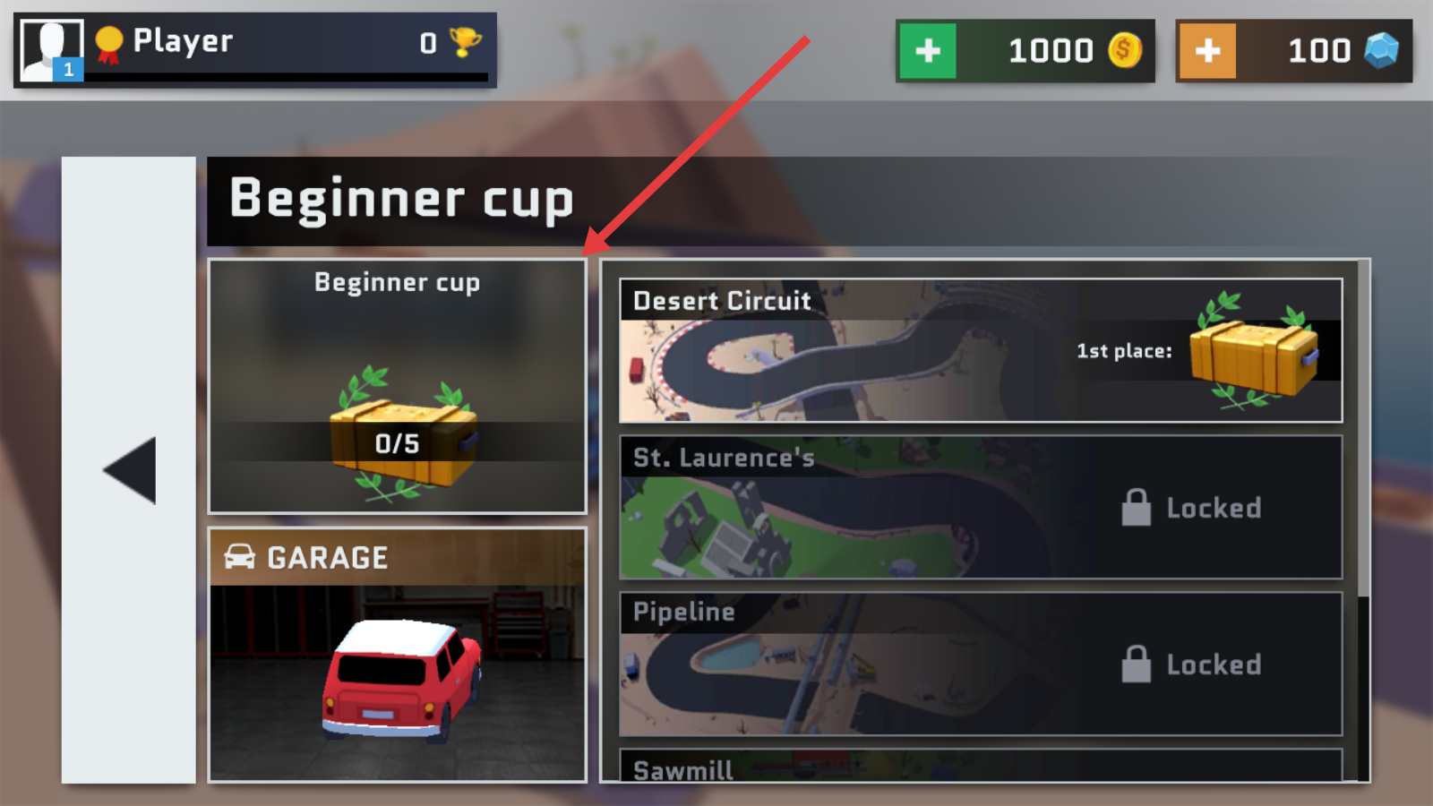 4、在赛事选择界面,例如Beginner cup新手杯赛选择你想要参加的比赛,不同赛事可能有不同的赛道和奖励,满足条件可解锁新赛道。