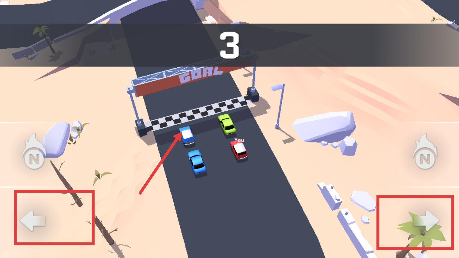 2、在比赛过程中通过屏幕左下角的方向按钮控制赛车左转,右下角的方向按钮控制赛车右转,灵活操控赛车在赛道上行驶。