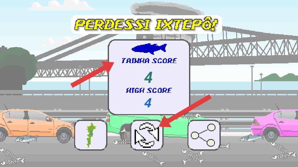 4、游戏结束后会显示TAINHA SCORE和HIGH SCORE,可查看分数,还能点击重新开始按钮,再次挑战游戏。