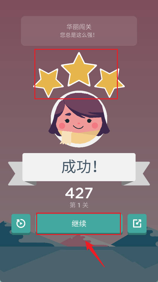 3、通关后获得评星与分数,点击“继续”进入下一关