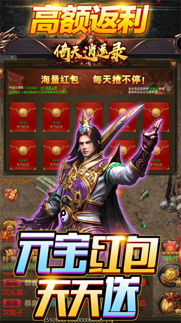 倚天逍遥录是一款仙侠手游,七日登录免费领红包,登录就送自选金将,送88888元宝和GM权限,丰富资源轻松玩海量福利人人有份,强力将领助阵沙场,每日签到那豪礼升级打怪两不误,每日送元宝逍遥不差钱。