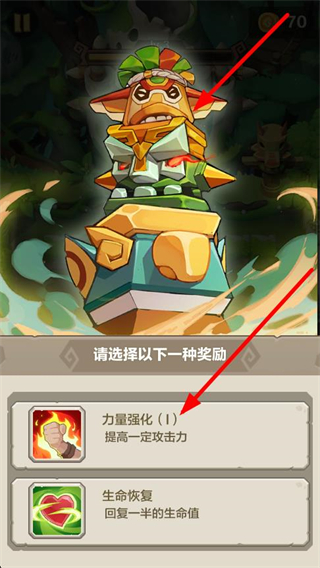 3、完成挑战后可选择奖励,如力量强化、生命恢复等,选择后提升角色属性,增强战斗能力。