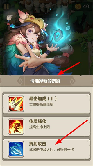 1、可选择新的技能,如暴击加成、体质强化、折射攻击等,选择后可增强角色战力,助力冒险。