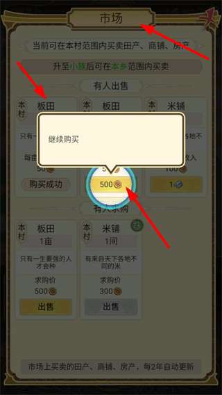 4、进入市场界面,可买卖田产、商铺等,如花费500购买板田,通过经营产业发展家族。