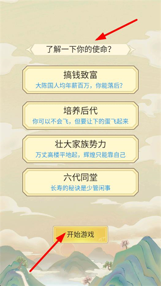 2、选择搞钱致富、培养后代等使命之一,点击开始游戏,确定家族发展的方向。