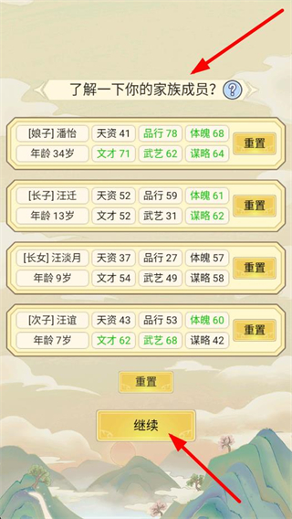 1、先了解家族成员的天资、品行等属性,查看后点击继续,开启家族经营的游戏进程。