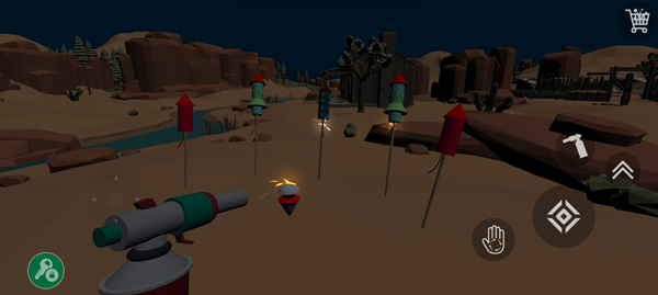 3、进入地图,现在正式开始教大家烟花模拟器这些按键功能:屏幕左边是移动,右边的按钮可以捡起烟花、摆放烟花、拿出点火器点火、跳跃,然后就是右上角的烟花商店按钮。