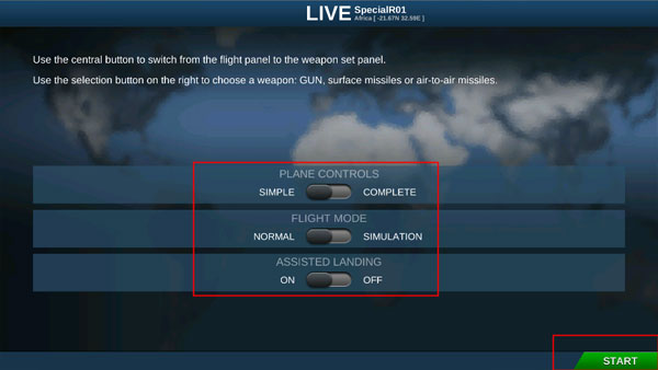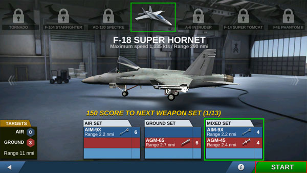 4、接下来就是选择战斗机了,选择飞机类型和导弹,点击“START”开始游戏。