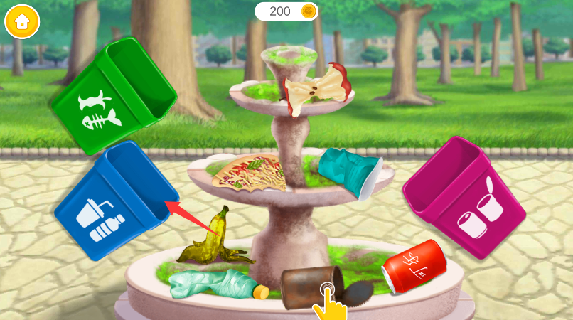 2、执行场景清洁任务行为逻辑,定位花池区域散落的垃圾实体,拖拽移动至对应分类垃圾桶投放口。