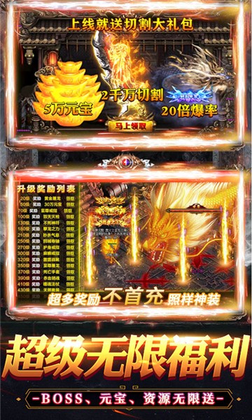 1、刀刀秒杀,无限福利,游戏内有各种各样的超强装备无线赠送。