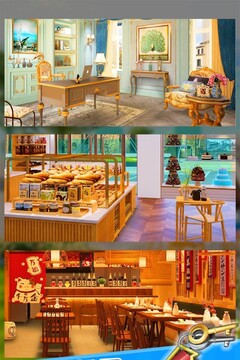 ①甜品屋建造:用消除获得的素材装饰店铺(摆放曲奇货架、糖霜壁画),吸引虚拟顾客提升评分。