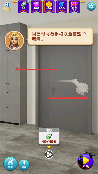 1、通过向左和向右移动来查看整个房间,界面还会显示地板材料的收集进度,让玩家清楚改造进展。