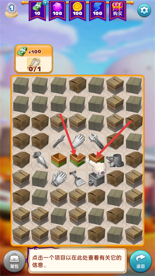 2、进入消除小游戏:当金钱不足时,点击右下角进入消除,通过拖动合并相同工具获得金钱。