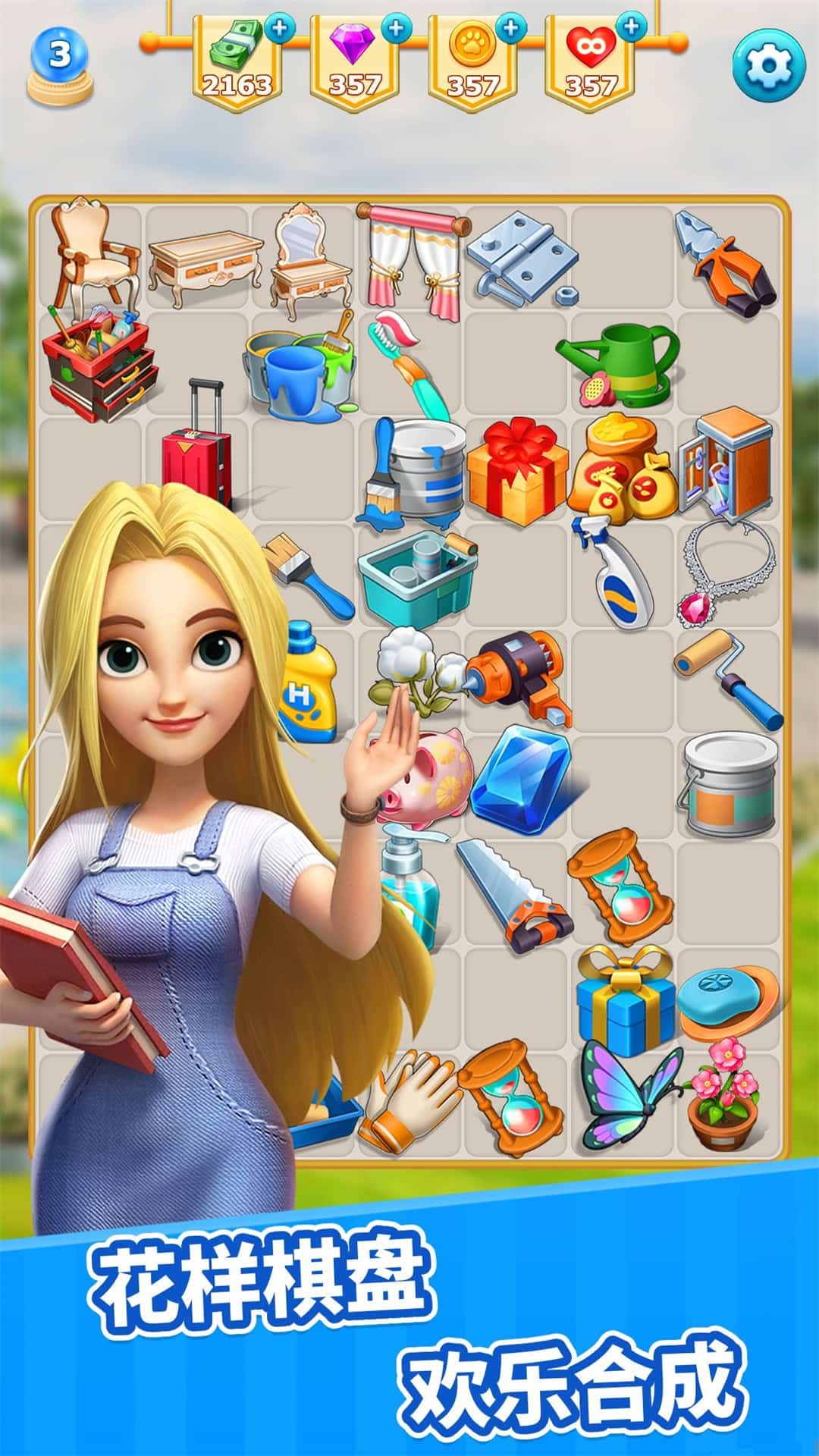 2、当金钱不足时,点击右下角进入消除小游戏。在这里拖动两个相同的工具将它们合并在一起,灰色的是无法直接拖动,只能被动合并,完成上方的工具任务时就可以获得金钱去进行装修。