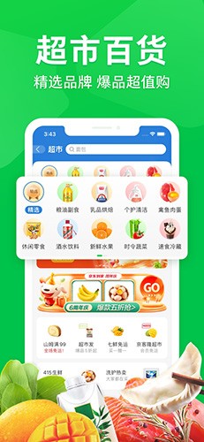 京东旗下拍到家服务正式改名为--京东到家服务。附近超市的所有产品,通通两小时达!上班的时候肚子饿了?京东到家官方版下载立刻帮你搞定!水果、零食、蔬菜还有鲜花和外卖,打开京东到家下载,从此不用再去超市排队。从京东到家app下载提供的品类来看,分为火锅涮肉、奶品冻品、生鲜熟食、休闲食品、酒水饮料、粮油调味、主食厨房和家居日用,基本涵盖超市所有品类,真正地将超市搬到了线上。
