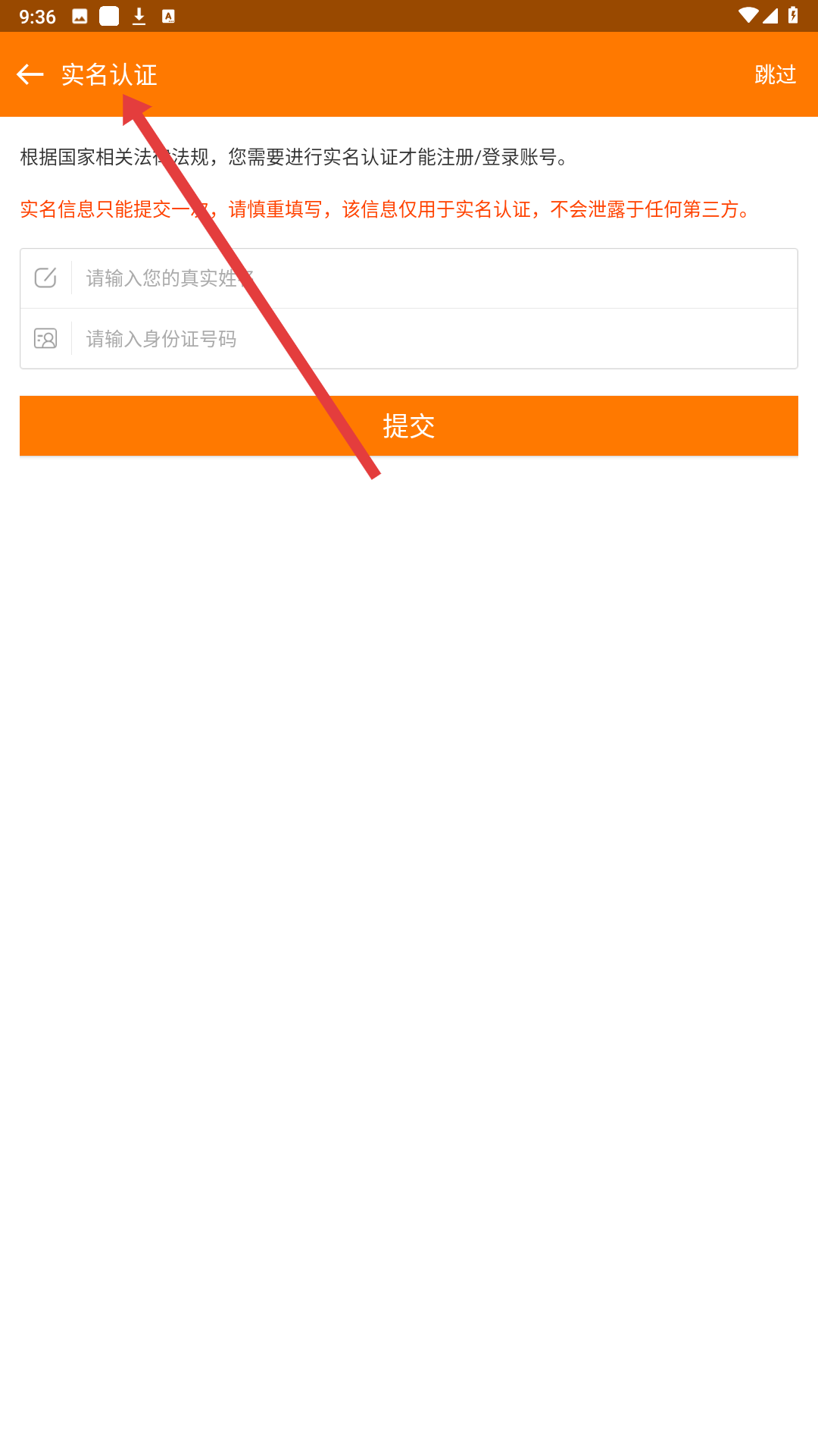 3、登录时需进行实名认证,实名认证页面输入真实姓名和身份证号码,点击提交,完成认证流程。