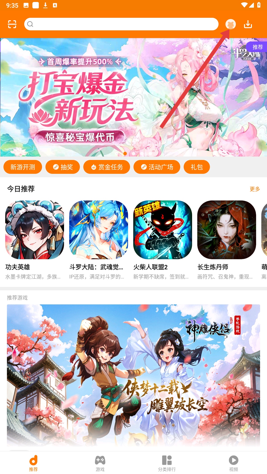 1、进入平台首页,可见搜索栏、推荐游戏及新游开测、抽奖等功能按钮,可浏览推荐游戏,开启游戏探索。