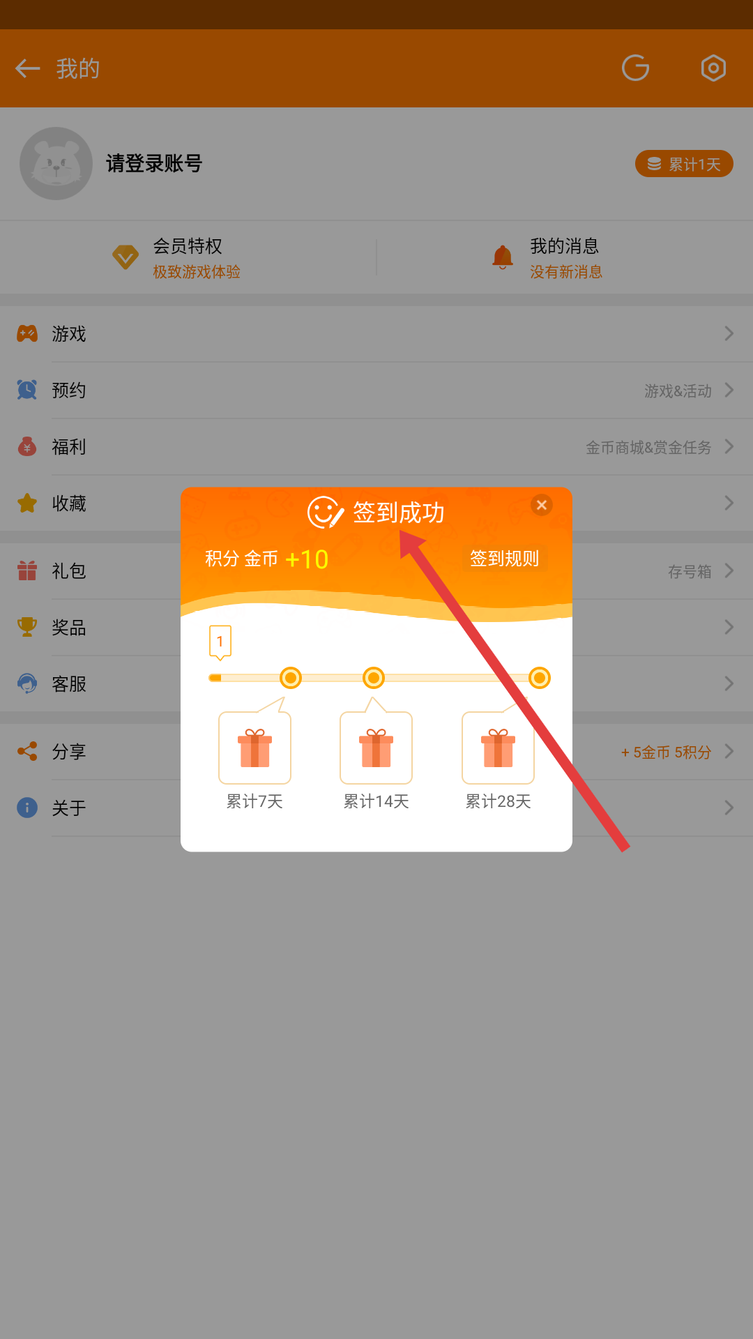 4、登录后可进行签到,签到成功会弹出提示框,显示积分金币,还有累计签到天数对应的奖励,可通过签到获取奖励。