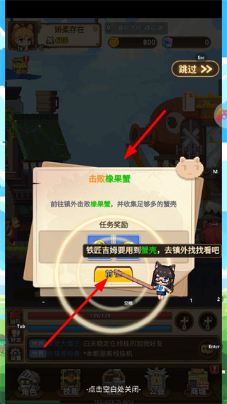 1、接受击败橡果蟹任务,前往城外讨伐橡果蟹,收集蟹壳,获取任务奖励,推进冒险大陆的剧情发展,提升角色等级。