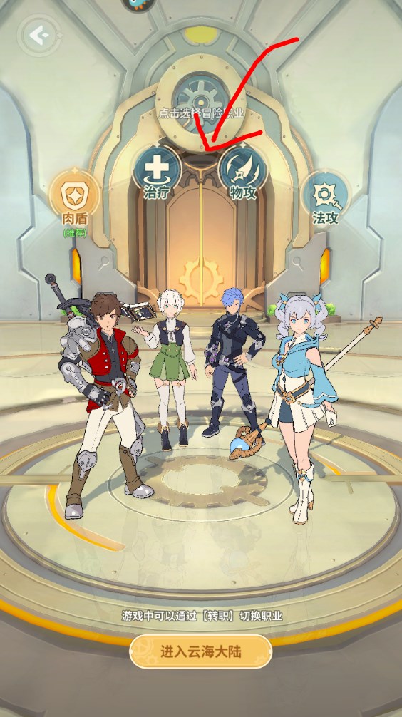 3、进入游戏首先是职业选择界面,肉盾、治疗、物攻、法攻四大类,随便选一个。