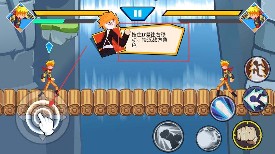 1、进入游戏根据提示按住移动键控制角色移动,靠近敌方角色,右侧有多种技能按钮,可提前熟悉这些按钮,为发起攻击做准备。