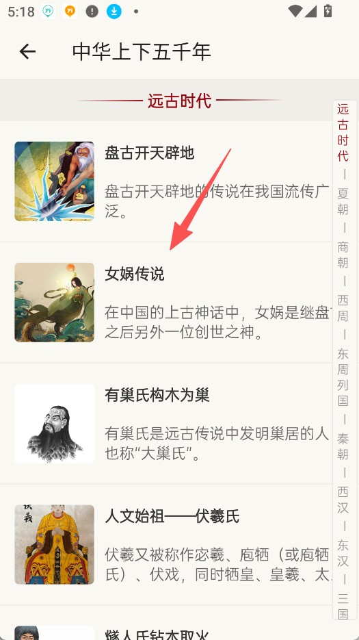 2、在列表中,点击想要查看的历史内容标题,如女娲传说。